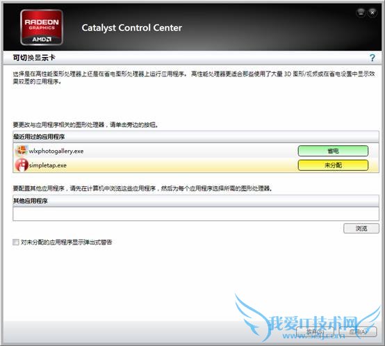 下方“其他应用程序”处可以选择“浏览”手动添加应用程序,指定改程序使用的显卡。