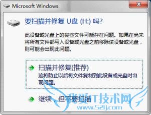 这个提示窗口是因为插入的闪存或者移动硬盘中存在错误文件所致,其实只要根据提示点击“扫描并修复”就可以解决。但是在随后的使用,该提示窗口又出现了,即使在设备中没有错窗口也会弹出来,那么此时我们就应该从源头来解决问题。