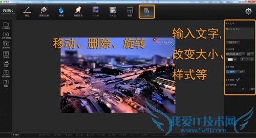 打开好照片,导入需要添加水印的图片,切换到文字,在右边的文字输入框里输入你的专属水印文字,点击应用。选择字体、文字大小和颜色,还可以为文字加粗、倾斜或者添加下划线。文字的排版可横版和竖版切换,阴影和透明度也可以选择和调整。