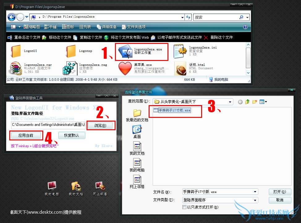 从此再也不用面对系统的那个 “傻蓝界面”了哈哈,桌面天下提供了很多登陆界面下载,其实都是从Logonxp格式转换成了EXE方便大家下载的,当然大家也可以自己转换,这个留在下文中再讲解!