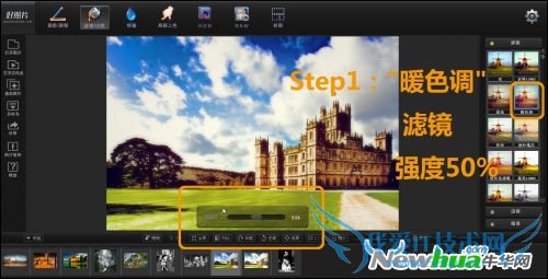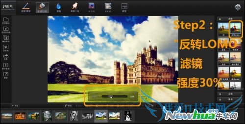 第四步,小编依次使用“暖色调”、“反转lomo”和“泛黄”滤镜,打造出贵族的梦幻色调。在这里小编鼓励大家在使用滤镜的时候多次尝试,因为不同种滤镜可以搭配出千万种不同的效果,也许你能发现更加奇幻的色彩呢。