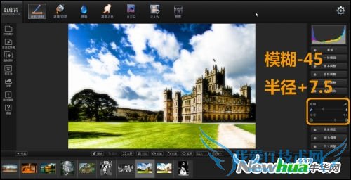 第三步,点击“模糊锐化”,降低锐化值,增加模糊半径。不仅仅是增加古典绘画色彩的朦胧感,这种模糊的感觉对《唐顿庄园》整个故事梦幻般的环境也是一种有效地烘托。
