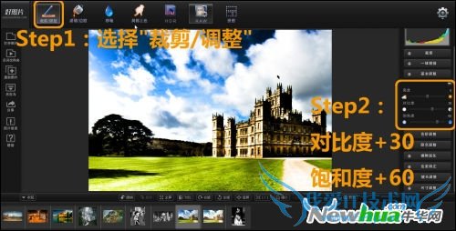 第一步,选择“裁剪/调整”,加大图片的对比度,使得庄园和草坪更有画笔描摹的感觉。由于后面会有多步骤的制作,尤其是滤镜的多次叠用会导致色彩的部分缺失,因此在加大图片的饱和度作为前期的准备。