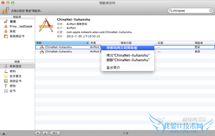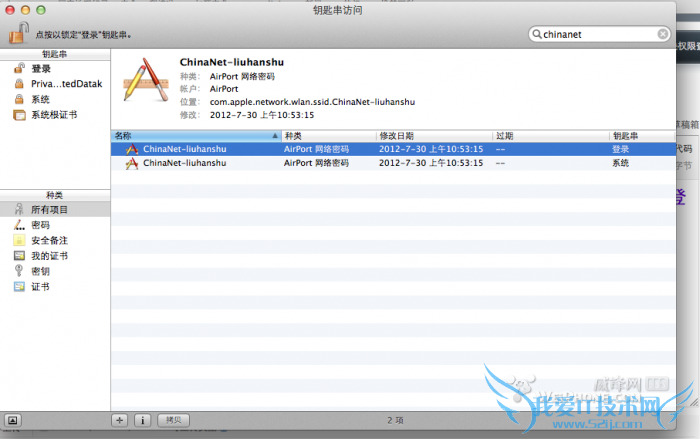 首先,打开应用程序---实用工具,找到“钥匙串访问”(如果实在找不到就用spotlight搜一搜),打开之后你会看到象图中一样的东西。