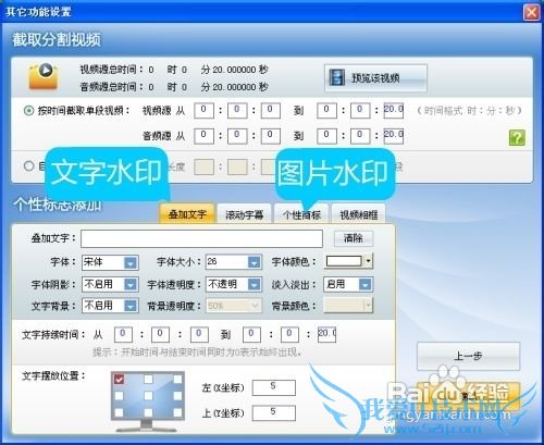导入待添加水印的flv视频,直到进入如下的“其他功能设置”对话框,在这里可为视频添加文字水印或图片水印,如在该对话框下方的“叠加文字”选项卡,可以为视频加文字水印,在“个性商标”选项卡,可以为视频加图片水印,还能在各自的选项卡中设置各种参数,如水印的出现时间、摆放位置等等,参数设置非常齐全。