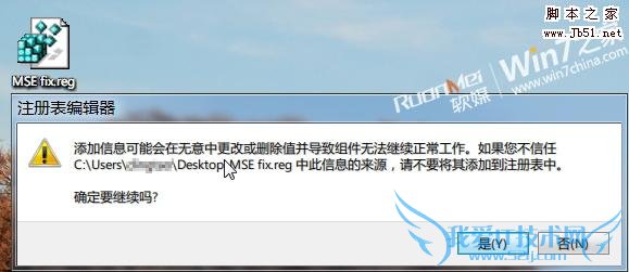 第三步:双击桌面上的 MSE Fix.reg 文件导入注册表,弹出确认提示时,点击“是”。