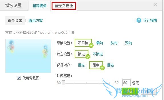 点击“浏览”上传想要使用的背景图片,在设置背景图中勾选锁定/平铺及对齐方式(居中、居左、居右),同时可以选择顶部高度(80、120、180);