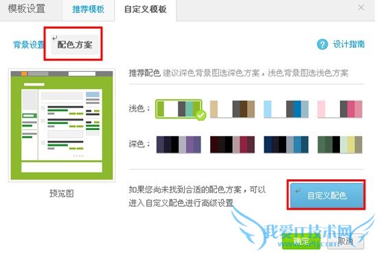 通过“配色方案”您还可以为主页进行配色方案选择,或通过“自定义配色”自主设计页面配色。