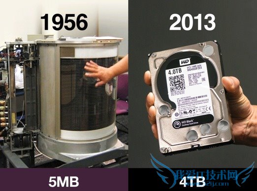 2、1956年,第一块硬盘容量只有5MB,体积比2个冰箱还大。2013年主力硬盘容量是4TB,大小只有3.5"。希捷预计,2020年,采用新技术的机械硬盘的容量将达60TB。哇,好大的容量啊: