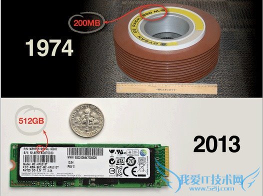 4、如果不看技术,只看功能方面,差距更大。1974年的机械硬盘容量只有200MB,重达10磅。而2013年一个东芝512GB的PCIe NAND闪存磁盘,只有一条内存大小: