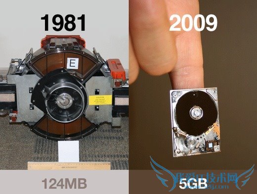5、就算同样是机械硬盘,情况也大不相同。左边是1981年DEC的硬盘,用当时流行的14”的盘片制成。而右边是希捷的微硬盘,尺寸比1.8"还小,但容量去大得多: