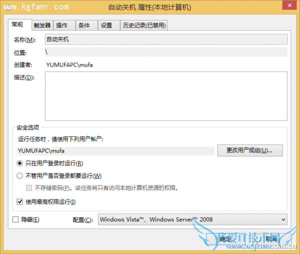 完成任务的创建后打开属性窗口,切换到“常规”,然后单选“只在用户登录时运行”,勾选“使用最高权限运行“(以免被UAC拦截无法运行)。这样只要指定用户登录系统,系统就会自动运行这个关机任务(图15)。