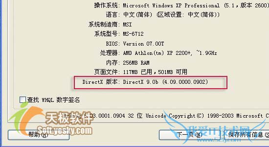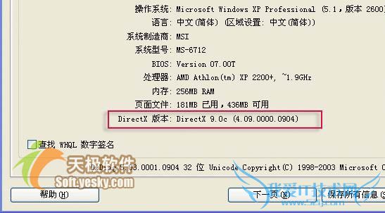 用户在WindowsXP系统中安装DirectX9.0c时速度非常快,不到2秒钟就完了,随后就出现完成对话框。而通过在“开始”菜单→“运行”栏中输入“dxdiag”调出DirectX诊断程序进行检测,也证实了我的猜测 —— 当前的DirectX版本仍为9.0b,9.0c并未安装成功。