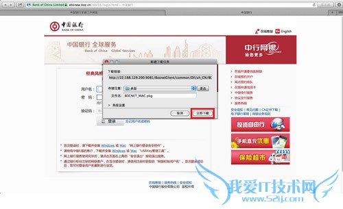 1、打开中国银行门户网站,进入网银登陆页面,点击页面下方的Mac链接,在弹出窗口中选择安装路径“桌面”,点击“立即下载”下载安全控件。