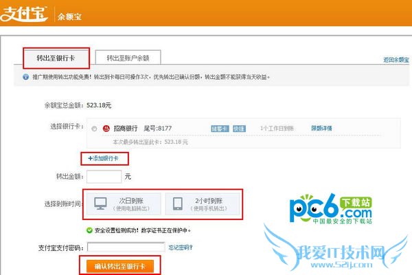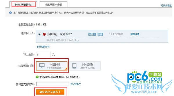 3、选择【使用电脑转出】:以【次日到账——使用电脑转出】为例,输入支付密码,点击【确认转出】,页面会提示本次转出到卡到账时间,请关注。(余额宝转出的卡到账时间)