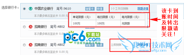 1)选择账户已绑定卡:页面会显示该卡转出至银行卡到账时间以及该卡转出限额,方便用户根据自身情况选择。