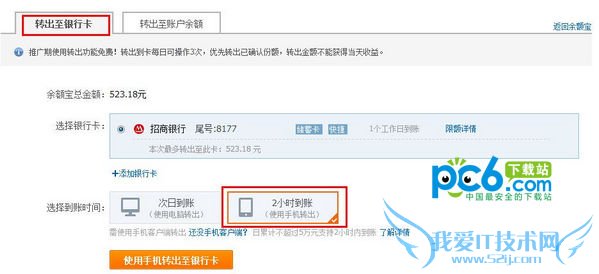 4、选择【使用手机转出】:选择【2小时到账——使用手机转出】,点击【使用手机转出】;