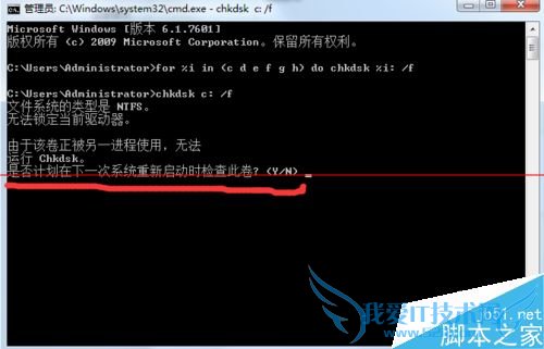 4、点击回车,会发现此时磁盘被占用无法检查,提示我们是否下次开机检查,输入n,点击回车