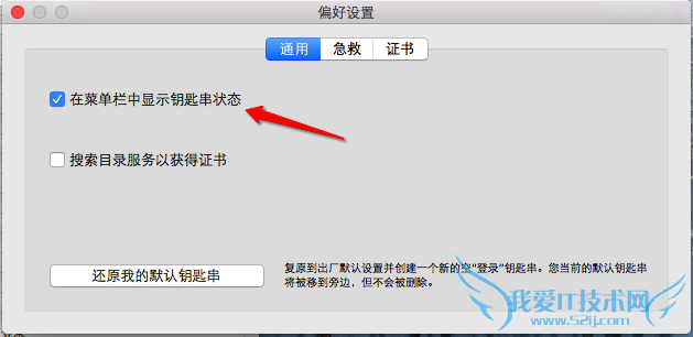 3、在钥匙串的偏好设置窗口中请勾选“在菜单栏中显示钥匙串状态”选项,如图所示