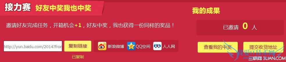 2、登录百度云账号,即获得开箱机会1次;登录百度云移动客户端,获得5次开箱机会;每成功邀请一位好友,再获得1次开箱机会,次数不设上限;(好友通过您的邀请链接登录活动页面,并登录客户端领取5次抽奖机会,视为成功邀请)