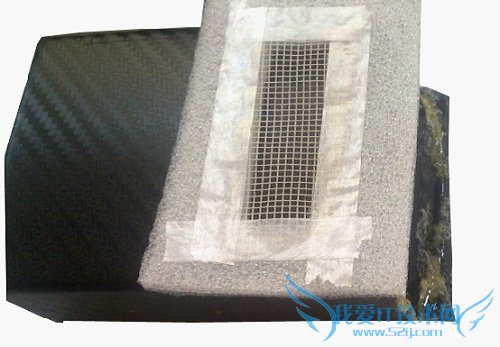 步骤五:接下来就是安装滤网降低排风噪音。在PVC发泡胶上裁出和笔记本散热口对应大小的口子,然后把裁成相同尺寸的网格用胶布粘在发泡胶背部,用万能胶把发泡胶粘在抽风散热器的出入风口
