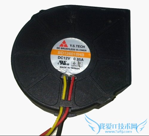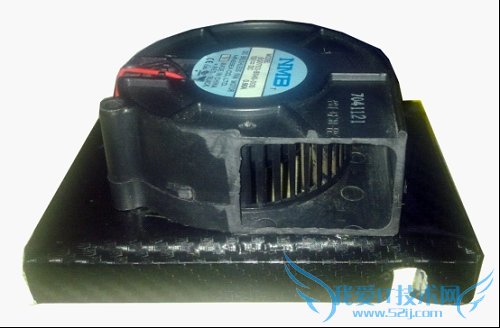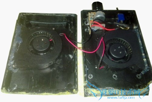 大电流风扇为0.7A电流,采用双滚轮珠式轴承,尺寸为75mm×75mm×30mm,全速运行时的噪音可以与1000W左右的电吹风机相提并论。不过由于体积过大,无法安置在塑料盒里,只能在塑料盒的上盖开一个与风扇入风口形状对应的圆口,然后将风扇固定在该处