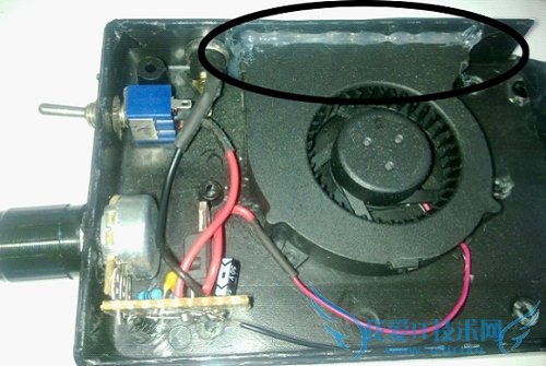 步骤三:把各个电子元件固定到开好的孔内,用热熔胶来固定风机、密封风机和外壳之间的空隙(图中画圈处),让它起到减震的作用。然后将开关和电源插座串联,然后接LM317T芯片的电压输入,风扇接电压输出。注意各个接头要用热缩管包起来,然后用吹风或者烙铁烫一下,保持稳定
