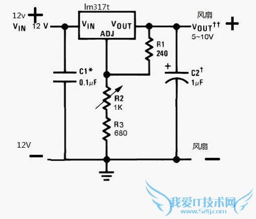 材料准备:我们需要1K大小的电位器、钮子开关、电源插头、LM317T芯片、0.1uf的无极电容、 1uf的有极电容、240Ω和680Ω的电阻、导线若干、洞洞板一张、电位器旋钮一个。这些都可以在电子市场轻松买到的。风扇方面我选择了两个AVC品牌,采用磁悬浮轴承的风扇,型号为5010,也就是说长宽都约为50mm,而高度为10mm。他的电流也是同型号风扇中最大的,标称0.25A,实测 0.14A。