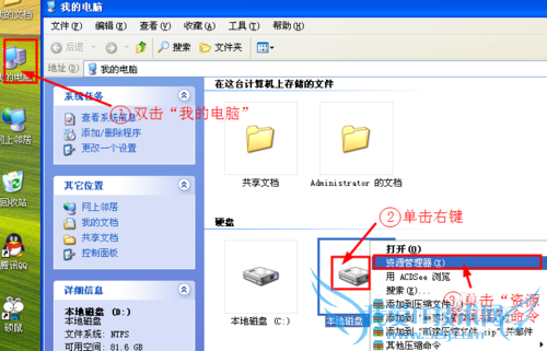2、双击”我的电脑“图标弹出对话框——选定某一磁盘单击”右键“弹出下拉菜单——选中”资源管理器“打开,如下图