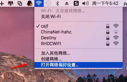 步骤一、点击顶部无线网络图标,下拉菜单中选择“打开网络偏好设置”