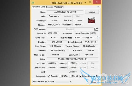 这 一小节的重点是15英寸高配版MacBook Pro所使用的AMD R9 M370X独立显卡,已经有用户证实这块R9 M370X就是3年前AMD出品的桌面端HD 7770的马甲。根据GPU-Z的信息,其采用28nm制造工艺,拥有640个计算核心,核心频率800MHz,显存频率1125MHz,显存位宽 128Bit,显存容量2GB GDDR5,显存带宽72GB/S。单从规格来看还算不错,大致相当于N卡的GTX 960M,这块AMD显卡的问题在于它的能耗比远不如英伟达最新Maxwell架构GPU,它能否在MacBook Pro上实现满载发挥我们并不确定。