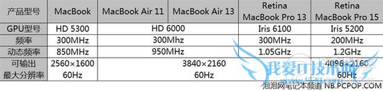 除了15英寸MacBook Pro的高配版外所有的苹果笔记本都采用了核芯显卡,核芯显卡的性能也随着处理器性能增加而增加。