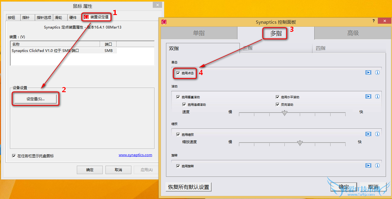 在鼠标属性里,打开“装置设置定值”的“设定值”,多指选项里有“双指”复选上“启用单击”,确定后此功能就开启了。下图是yoga11S上设置界面: