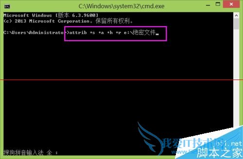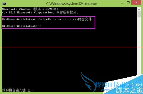 3、进入cmd运行模式,在光标后面输入“attrib +s +a +h +r e:绝密文件”(注意中间都留有空格,而且是英文输入状态)