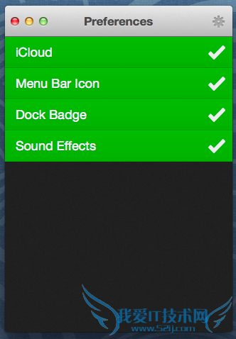 在设置里可以连接iCloud,Menubar,DockBadge(未完成任务数量提醒),Sound Effects(音效)。