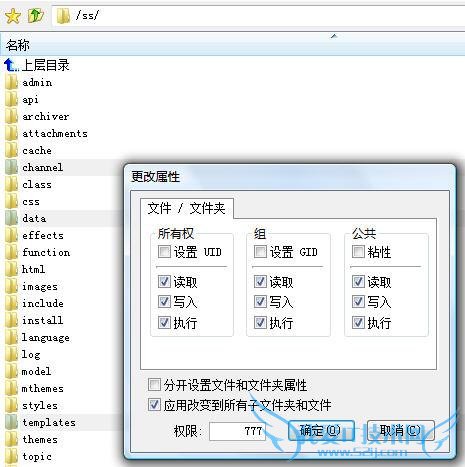 注意:如果有些文件需要其子文件也具有777权限,那么还需要选中“应用改变到所有子文件和文件”。