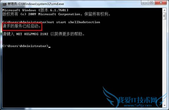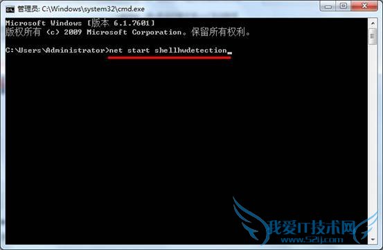 2、在dos管理员命令界面,在光标闪动处输入“net start shellhwdetection”,回车执行该命令,如下图所示: