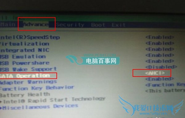 第二步:按ESC返回BIOS操作界面,找到Advance标签,选择“SATA Operation”选项,将硬盘模式切换到AHCI模式,按ESC,选择SAVE保存退出。