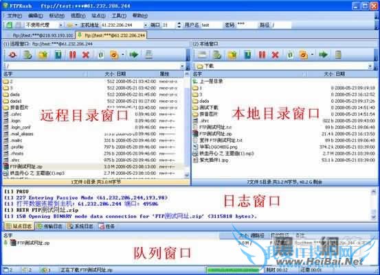 FtpRush试用版期限为30天。主界面默认显示了本地目录、远程目录、队列及日志四大窗口,默认本地目录窗口在右边,但可以通过切换轻松改变位置。