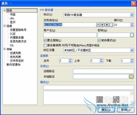 第一步:按照界面所示,我们在常规选项中分别输入主机地址(即FTP服务器所拥有的IP地址),用户名和密码(如果你不知道的话,可以询问提供FTP服务的运营商或管理员)。对于匿名选项我们不必选择 (匿名的意思就是不需要用户名和密码可以直接访问FTP服务器,但很多FTP服务器都禁止匿名访问)。对于端口号我们在没有特别要求的情况下就使用默认的(21),而不必再进行任何改变。