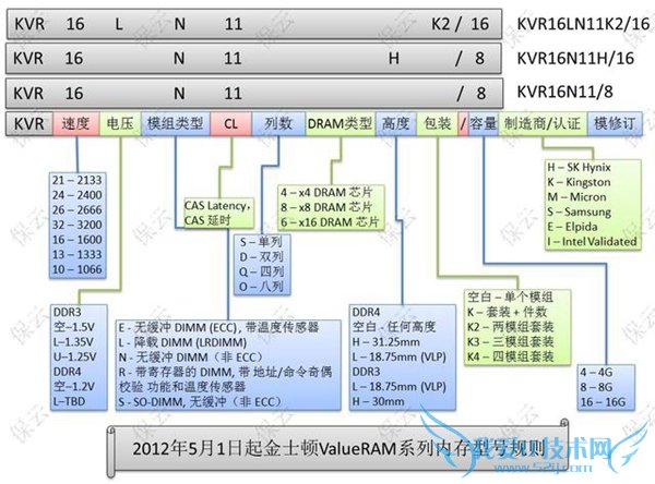 目前,金士顿在市面上的内存主要有两大系列——ValueRAM和骇客神条。下面笔者重点介绍ValueRAM系列。金士顿ValueRAM系列内存编号/型号规则从2012年5月1日起执行。