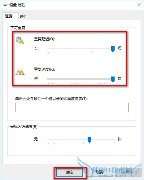 在打开的键盘属性窗口,在字符重复栏,把重复延迟(D)的滑块拉到最短位置,把重复速度(R)的滑块拉到最快位置(如图),然后点击:确定。
