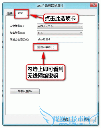 4、打开“安全”选项卡,勾选上“显示字符”即可查看到无线密钥。