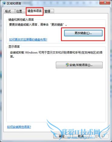 3.在弹出的区域和语言界面中,将上方的标签切换到“键盘和语言”,点击“更改键盘”按钮,如下图所示