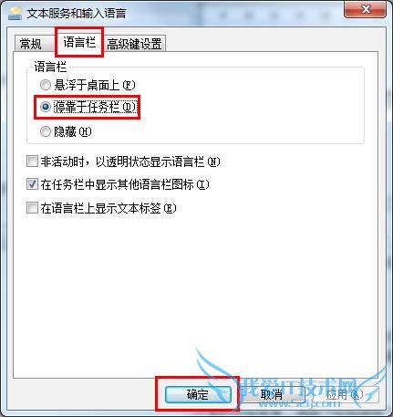4.此时会弹出如下界面,切换到“语言栏”标签,选择“停靠于任务栏”,点击“确定”按钮保存退出。