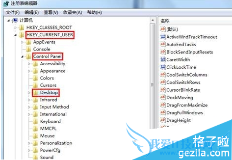 3、在注册表编辑器页面展开到“HKEY_CURRENT_USER/Control panel/Desktop”: