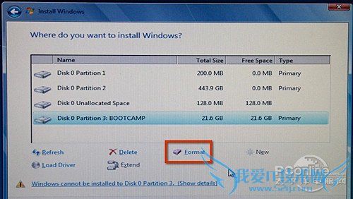 接下来的Windows安装过程,都和一般PC的安装过程一样,唯一要注意的是,在上图的过程中,一定要格式化后面有标记BOOTCAMP的分区为NTFS,方可安装。