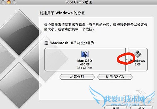 接着程序出现请你分割硬盘的画面,你可以拖住中间的圆点,左右移动,来调整你要分割多少给Windows使用,接着按下分割就可以了。因为安装的是Windows 7,所以建议此分区的空间最好在20GB以上。