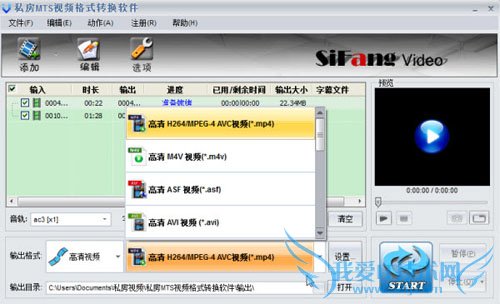 当我们看到软件主界面中都显示着添加文件列表时,说明这些MTS格式文件已经顺利添加进去,接下来我们就要选择一种输出格式。由于该软件已经把几乎所有常用视频格式都预置在输出格式中,所以我们只需点击输出格式的下拉列表就能轻松选择,而每一种视频格式对应的音视频参数私房MTS格式转换软件也会根据用户的选择自动进行调整,就无需我们麻烦的手动去调整了,总之输出画质最佳的视频文件操作就是如此简单!