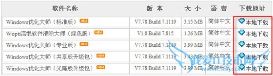 Windows优化大师下载分为:Windows优化大师(标准版)、Windows优化大师(专业版)、Windows优化大师(共享版升级包)、Windows优化大师(光盘版升级包)以及wopti流氓软件清除大师(绿色版);您可根据自己的实际需要进行下载,点击“本地下载”。